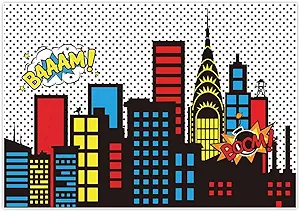 Allenjoy 7x5ft Photography backdrops Superhero Super City Skyline Buildings Children Birthday Party Event Banner Photo Studio Booth Background Baby Shower Photocall Decorations Supplies