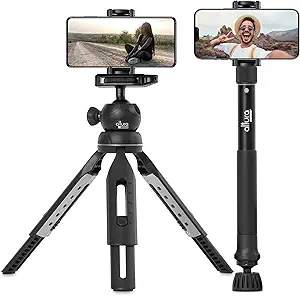 - UNIVERSAL COMPATIBILITY: Works as Go Pro tripod, mini tripod for camera, mini tripod for iPhone, vlogger kit, iPhone tripod, monopod, GoPro stand, small tripod for iPhone, mini tripod for camera, tripod for camera vlogging, etc. Fits cellphones, smartphone, compact cameras, 360 cameras, and GoPro and other action cameras; Can be used with any camera that has a ¼-20” screw. BONUS: Can even be used to mount an LED light or a flash.