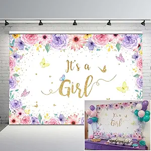 Avezano It's a Girl Baby Shower Backdrop Purple and Pink Floral Girl Baby Shower Background 7x5ft Vinyl Flowers Butterfly Gold Dots Girl Baby Shower Decorations Backdrops