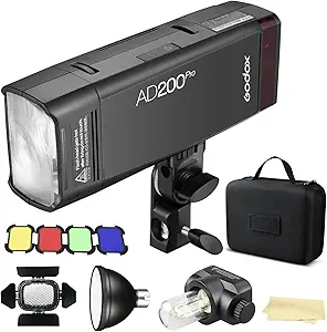 - Lightweight and Pocket Size, great portability. High-quality and clear AV Panel offers convenient operation. The AD200Pro can be mounted via a 1/4" threaded mounting hole on either side of the flash (allowing landscape or portrait orientation when using the speedlite head).