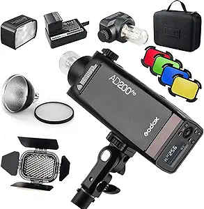 - 🌿 |2.4G Control with 330Ft Range|: Godox AD200Pro supports Nikon, Canon, Sony, Fujifilm, Olympus, Panasonic and Pentax TTL. With Master&Slave Function, AD200Pro Can be Used in Combination with Godox TTL Camera Flashes, TTL Outdoor Flashes, etc
