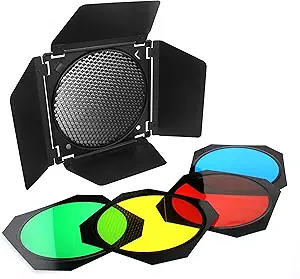 Godox BD-04 Barn Door Barndoor with Honeycomb Grid and 4 Color Gel Filters (Red Yellow Blue Green) for 7" Standard Reflector