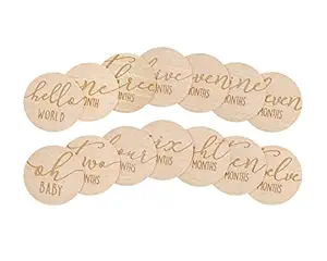 - Includes 7 double sided wooden prop cards labeled "one month" through "twelve months", "hello world" and "oh baby"