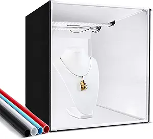 I make rustic bronze jewelry which is very hard to photograph, this box, with its foil interior, really helps to punch back the high shine that I usually get. So easy to adjust the lighting to suit the object. I look forward to many years of happiness with this box. No more replacing boxes that just did do the trick. An added benefit to me, the front cover comes completely so that I can swap out background without any trouble AND it keeps the cats (and cat hair) out of the box, a problem I've had for years.
