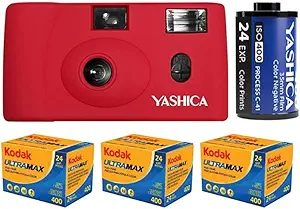 - Bundle Includes: YASHICA MF-1 Snapshot Art 35mm Film Camera Set (Red) and 3 Kodak GC/UltraMax 400 Color Negative Film (35mm Roll Film, 24 Exposures)